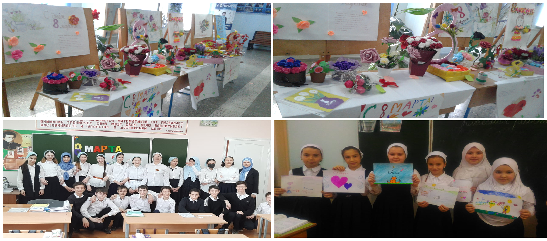 Конкурс стенгазет, приуроченных празднику «8 марта» (7-11классы); Конкурс рисунков «Моя любимая мама» (1-6классы); Поделки, сделанные руками детей для мам, бабушек, сестер (1-7классы) Выставка художественной литературы с произведениями, посвященным женщинам Чечни.