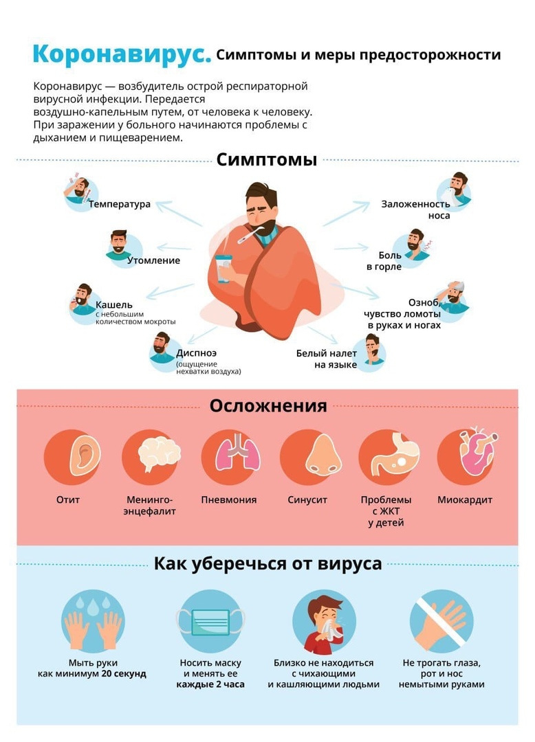Часто мойте руки водой с мылом или обрабатывайте их антисептическим средством на основе спирта;Мойте руки после посещения мест массового скопления людей и перед приемом пищи;Употребляйте только термически обработанную пищу, чистую воду;При кашле и чихании прикрывайте рот и нос рукой или салфеткой, использованную салфетку сразу выбрасывайте и вымойте руки;Избегайте близкого контакта с людьми, у которых имеются признаки лихорадки и кашель;При первых признаках заболевания: высокая температура (лихорадка от 38*С), кашель, затрудненное дыхание, обращайтесь за медицинской помощью в лечебные организации, не допускайте самолечения;Если Вы находились последние две недели в Китае (КНР), сообщите о времени и месте пребывания медицинскому персоналу.