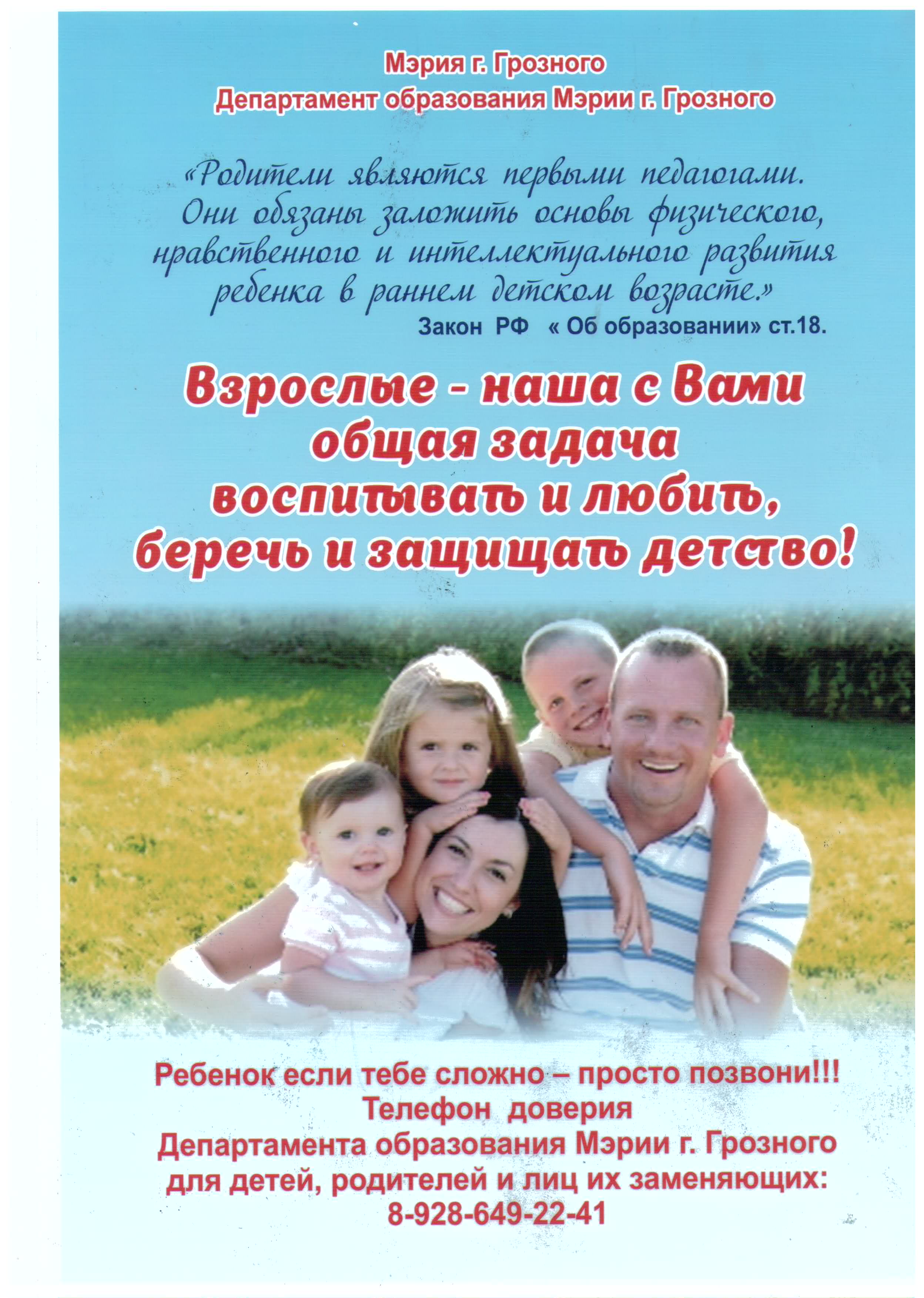 Телефон доверия Департамента образования Мэрии г.Грозного, для детей и родителей и лиц их заменяющих: 8 928-649-22-41