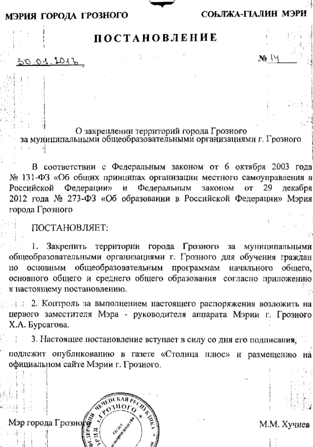 Постановление Мэрии г.Грозного №14 от 30.01.2017 г. "О закреплении терииторий города Грозного за муниципальными общеобразовательными организациями г.Грозного"