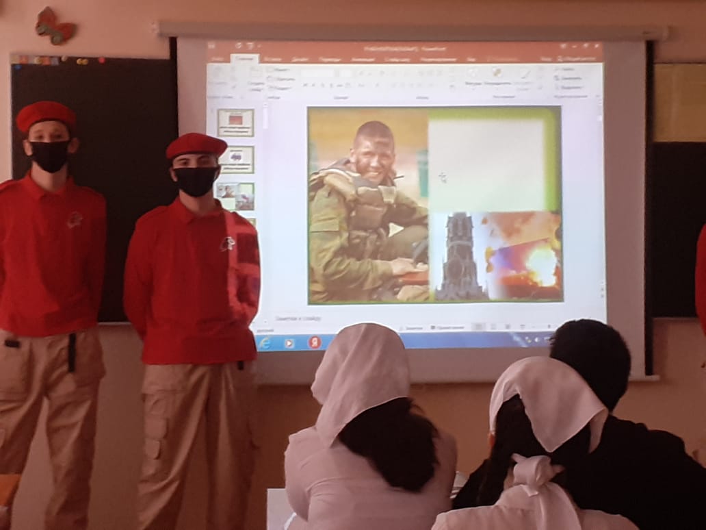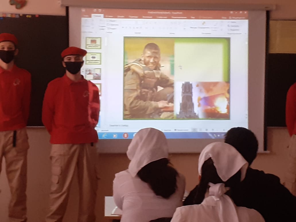 22.02.2022г. в МБОУ "СОШ №5 им. З.А. Кадырова" г.Грозного, был проведен "Урок Мужества" с участием активистов военно- патриотического отряда ЮНАРМЕЙЦЫ