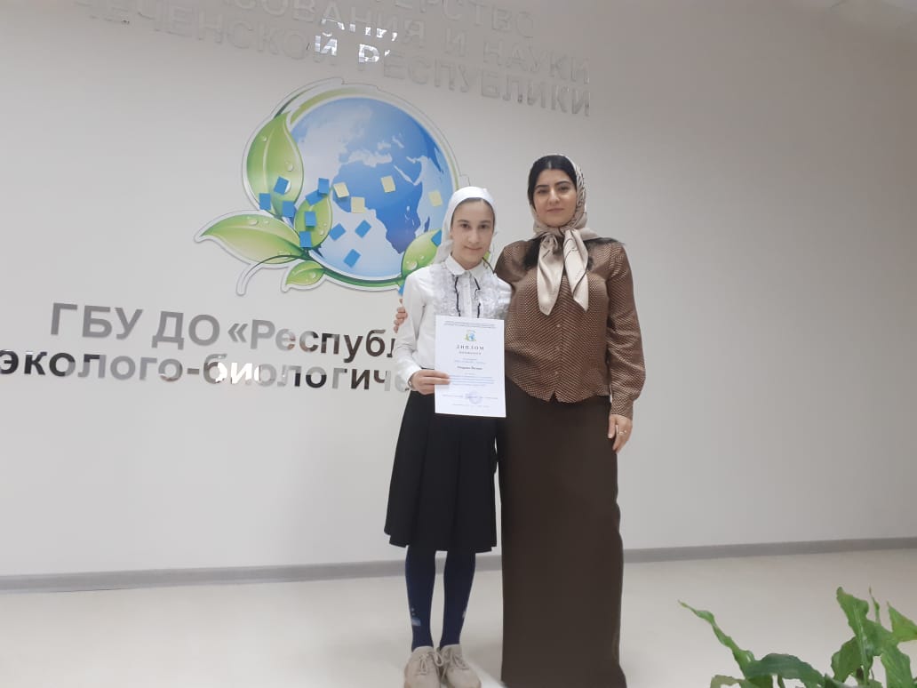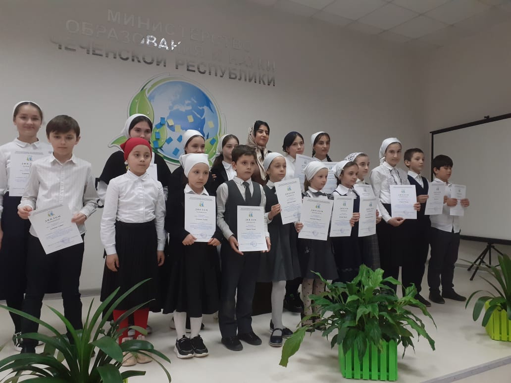 Участники конкурса "Зеленая планета". Ученики МБОУ"СОШ5 им. З. А. Кадырова" г. Грозного, заняли призовые места: Очарова Езира -1 место; Закриева Самира-2 место; Такаев Рашид- 3 место.