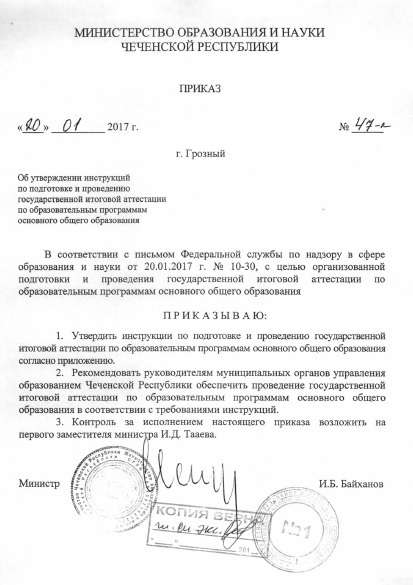 Приказ № 47-п от 20.01.2017 "Об утверждении инструкций по подготовке и проведению ГИА по образовательным программам ООО"