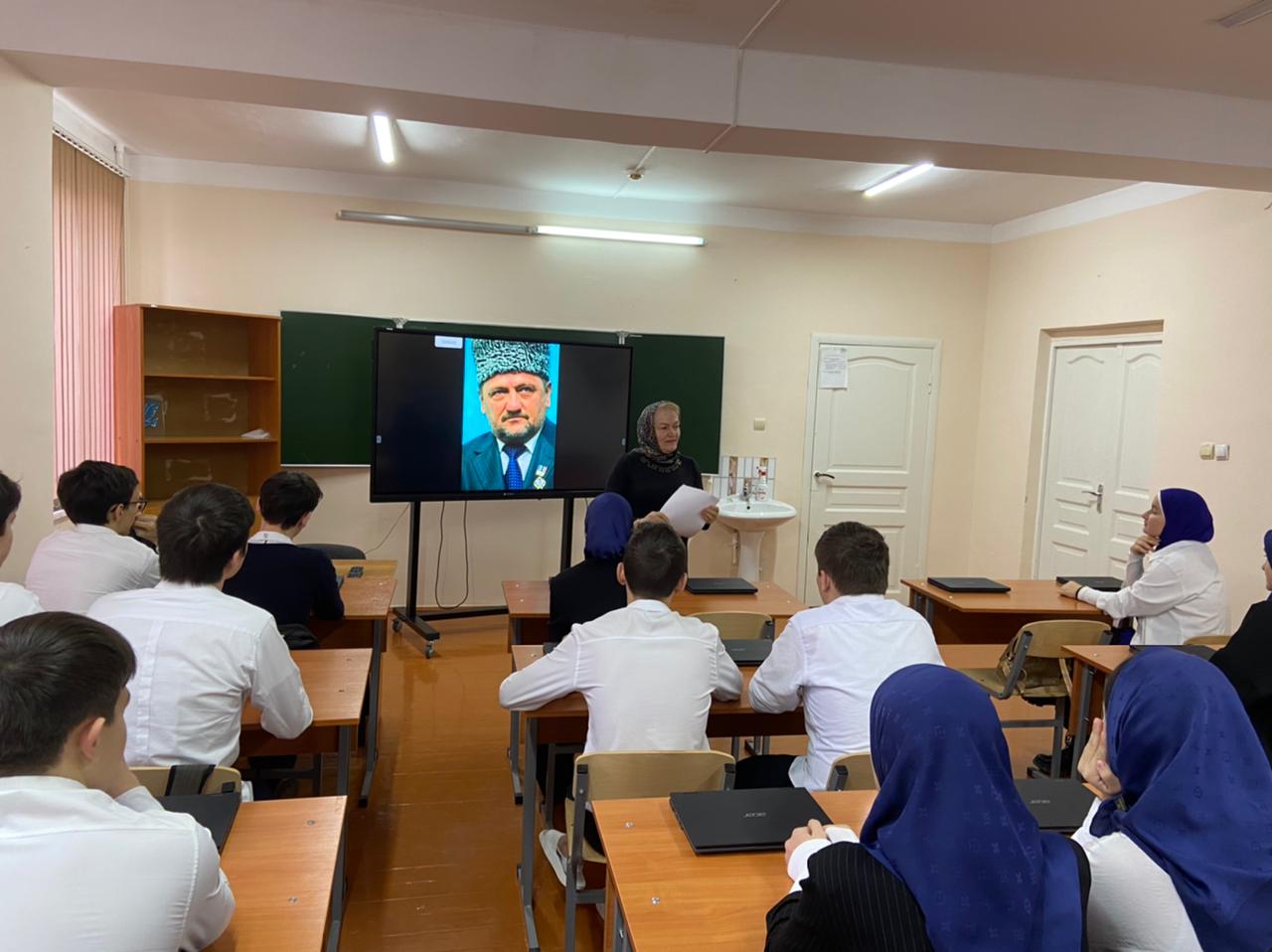 09.12.202209.12.2022г в МБОУ "СОШ 5 им. З. А. Кадыро" г. Грозного, была проведена лекция "Герои Отечества" для обучающихся 10-11 классов. Лекцию проводила научный сотрудник музея им. А. Х. Кадырова, Азиева Любовь Махарбиевна. В лекции были приведены исторические данные о 23-х героях, получивших высшую награду-орден "Герой России"и среди них: А. Х. Кадыров, первый президент Чеченской Республики и самый молодой Герой России, 15-летний Магомед Ташухаджиев.