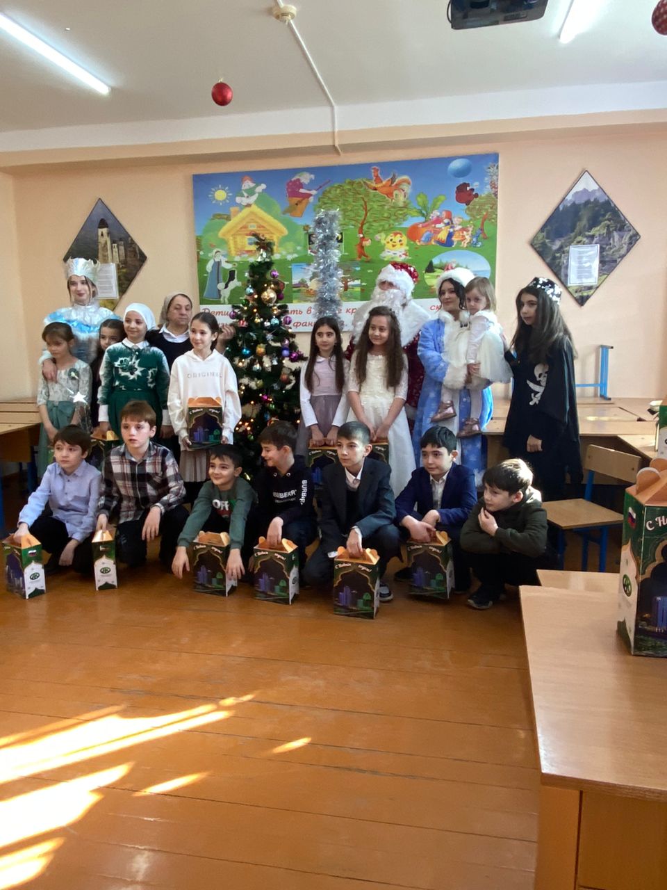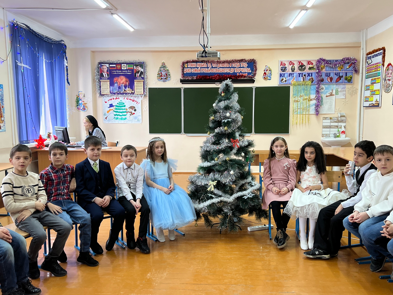 24.12.2022г. в МБОУ "СОШ 5 им. З. А. Кадырова" г. Грозного, были проведены новогодние утренники (в классах)