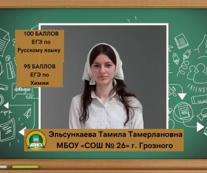 20.06.2024Эльсункаева Тамила Тамерлановна, ученица МБОУ «СОШ № 26» г. Грозного, получила 100 баллов на ЕГЭ по русскому языку и 95 баллов по химии.