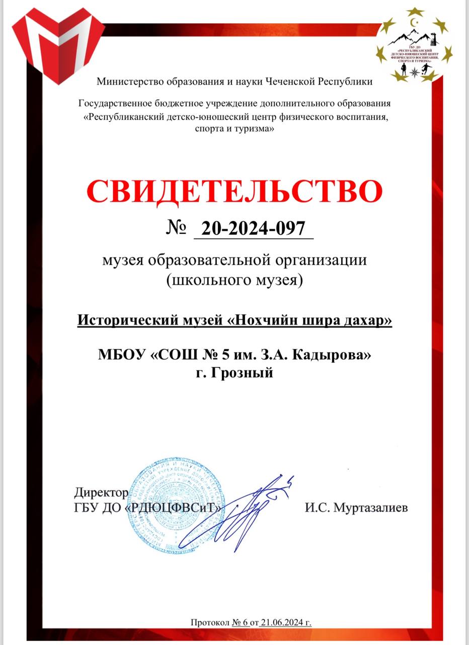 07.08.2024Теперь и в СОШ №5 имени З.А. Кадырова есть возможность ближе познакомиться с наследием нашего народа, благодаря школьному историческому музею «Нохчийн шира дахар».